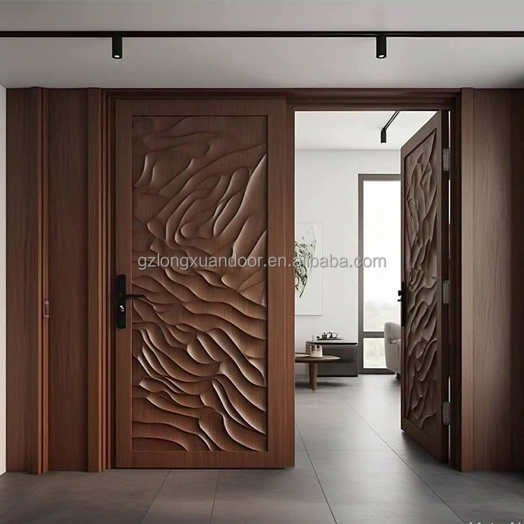 Luxury Villa Bespoke Flowing Textured Carving Solid Wooden Front Entry Door Exterior Main Entrance Door for House